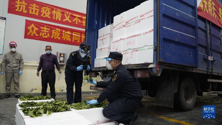 2月18日,番禺海关关员在检查供港蔬菜。新华社发