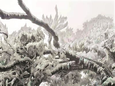 在海拔1056米的风子岩山上,树枝、茅草穿上了虎年的第一件“冰衣”,树木也被晶莹剔透的冰挂“压弯了腰”。行走山间、穿行寒雾,目光所及之处皆是银装素裹。而在乐昌两江镇狮子山,美丽的雾凇冰挂吸引众多市民前来“打卡”,他们在严寒中观赏玩耍。