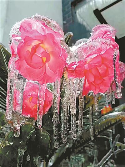 从高处俯瞰天湖雪景,白雪仿佛为万物描边,小城脉络清晰可见;树枝上垂着冰挂,晶莹玲珑,让人惊叹大自然鬼斧神工;黄花蕊叶上,露珠凝结成“珍珠”;菜叶上凝结透明冰块,揭开即成叶脉清晰可见的“冰菜”。