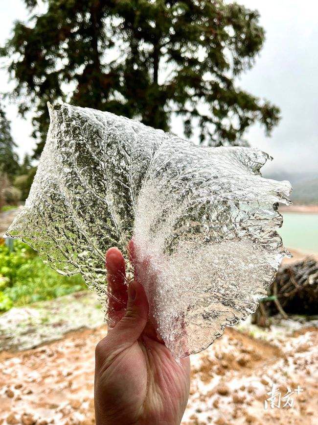 在韶关乳源,有市民称其开车驶入大桥镇红云村时,看到许多小冰粒打到了挡风玻璃上,要打开雨刮才能看清前方路面。“周边到处白茫茫,花草树木都变成了冰晶,仿佛进入了冰雪世界。”