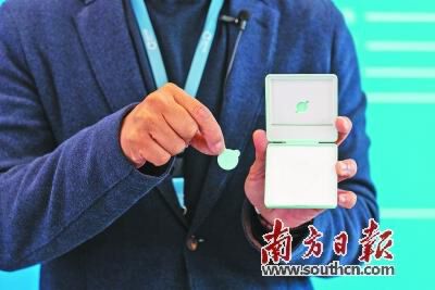 深圳市刷新智能电子有限公司研发的无线电子体温计只有一枚一元硬币大小。