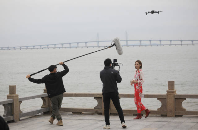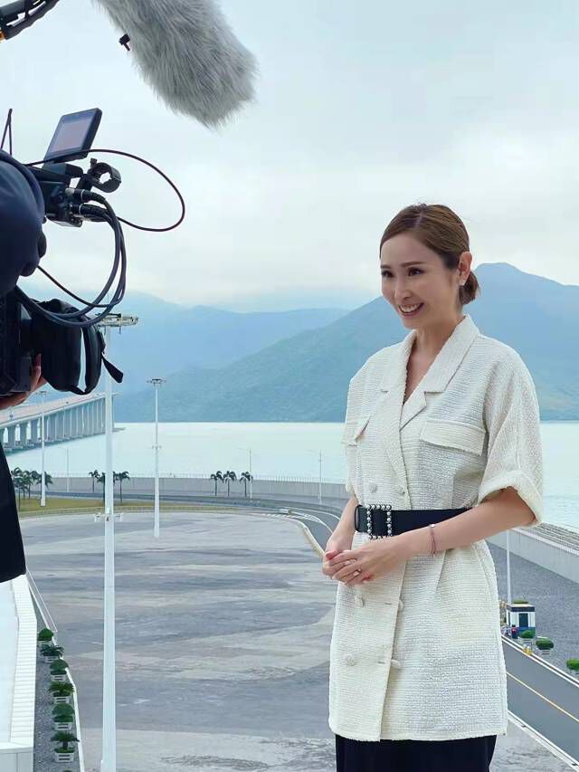 陈贝儿在港珠澳大桥上录制节目。