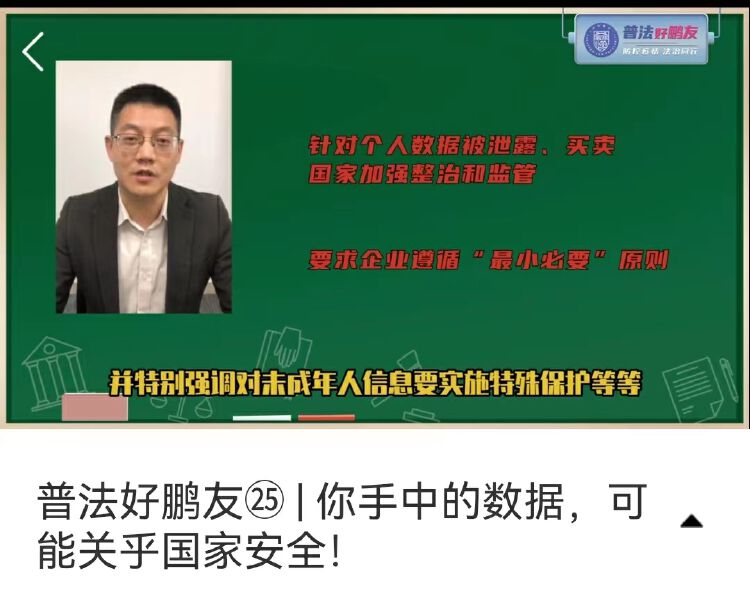 4月15日,市普法办邀请深信律师事务所周俊波律师作客公益普法短视频栏目《普法好鹏友》,围绕“数据安全与国家安全”主题进行普法,并推出《丛林法商会》系列普法漫画新一期“航运数据可以提供给境外咨询调查公司吗”,以生动有趣的形式为市民普及国家安全法律知识。