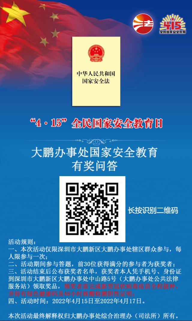 大鹏办事处方面表示,一切为了人民,一切依靠人民,强化公民的国家安全意识与责任,是国家安全的固本之策与长久之计,也是开展全民安全教育的意义所在。希望通过在辖区开展的系列普法活动,大力宣传国家安全观念,激发群众的爱国正能量,为普及国家安全教育贡献一份力量。