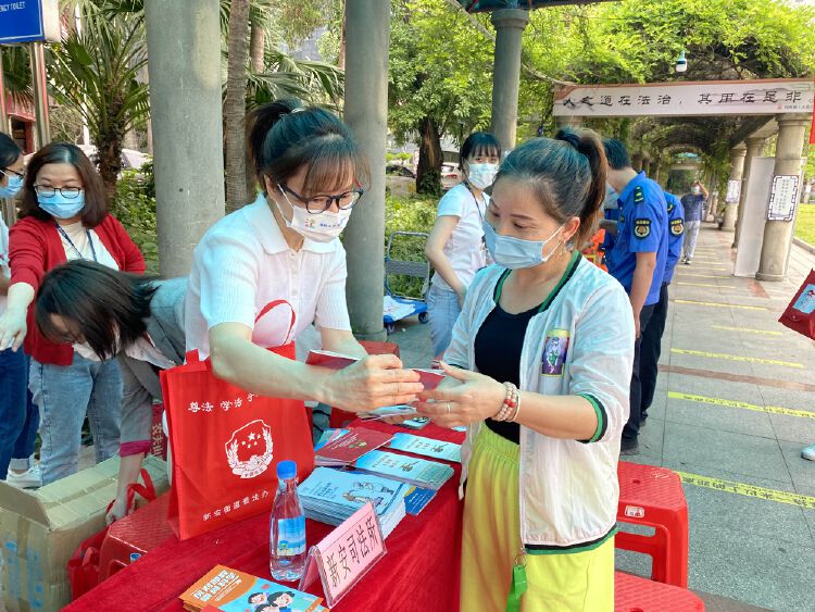 此次活动场地选在了新安街道法治文化公园里。刚升级改造的公园法治氛围浓厚,在公园的走廊两边悬挂着名人的法治名言警句、更新后的法治宣传栏张贴着与居民生活息息相关的以案释法图解,公园里各个角落分布着各式各样的法治宣传标语。法治标识与公园宽阔的休闲活动空间相结合,让居民群众在公园休闲娱乐时感受到法治文化的熏陶,在其中不断汲取法治文化的养分。据悉,此次活动选择在此地举行,亦有为新安街道法治文化公园的新生庆祝之意。