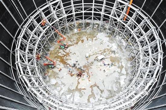 记者站在距底部40多米高的平层往下看,如站在十多层楼的楼顶,工程车辆、施工人员显得很渺小,宏大场景令人震撼。