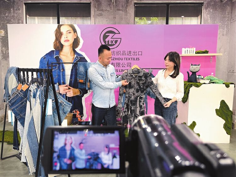 广州轻工工贸集团纺织品进出口公司员工在第131届广交会上进行直播(4月15日摄)。新华社发