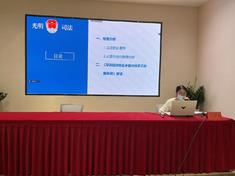 培训会上,光明区法律服务中心副主任陈丹从立法背景、条例重点内容等方面切入,并结合光明区人民调解工作实际,为各位学员解读《条例》。《条例》是国内同领域首部涉及全类型矛盾纠纷、囊括全种类化解方式、覆盖全链条非诉流程的地方性法规,从法律制度上贯彻落实源头治理理念,落实“把非诉讼纠纷解决机制挺在前面”要求,创设民商事纠纷中立评估机制,建立衔接机制,形成科学高效的解纷体系。