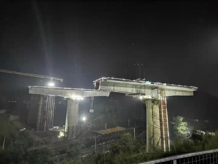 5月8日晚,广汕高铁跨京九铁路特大桥施工现场灯火通明,上百名建设者蓄势待发。随着现场总指挥一声令下,高33.4米跨京九铁路特大桥墩顶双幅转体梁作业正式启动。