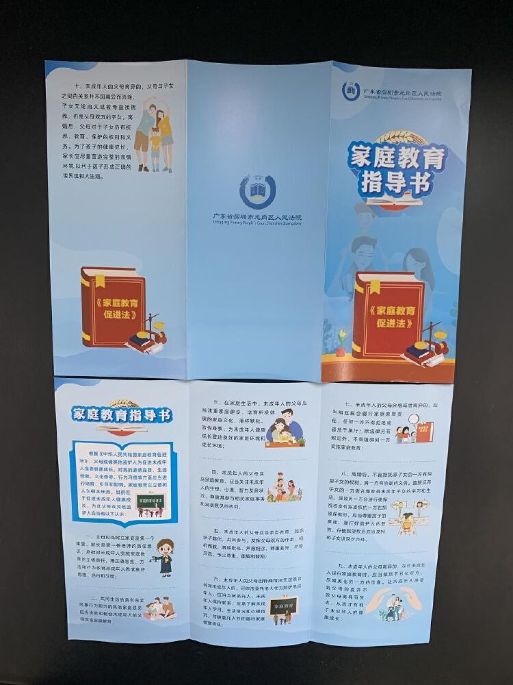 此外,为了使家庭教育普法宣传更加广泛、深入,龙岗法院还将《家庭教育促进法》的主要内容制作成宣传册页,通过立案、诉调对接等窗口平台,以及法官进社区、进学校等普法活动,向民众发放宣传,广泛引导人民群众不断强化注重家庭、家教和家风建设的理念。