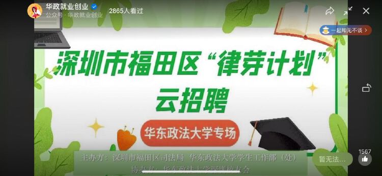 据悉,采用数字智慧化技术手段将招聘会搬上“云端”,并非首次运用于本场招聘会。早在去年12月,“律芽计划”已通过“云招聘”形式,先后向西南政法大学、中南财经政法大学、华东政法大学、武汉大学等16所知名高校“云推送”招聘岗位700余个。通过“i福田”微信小程序、腾讯会议、微信视频号等网络媒介,定期发布招聘公告、福田“英才荟”律师人才奖励政策等稳岗引才资讯。