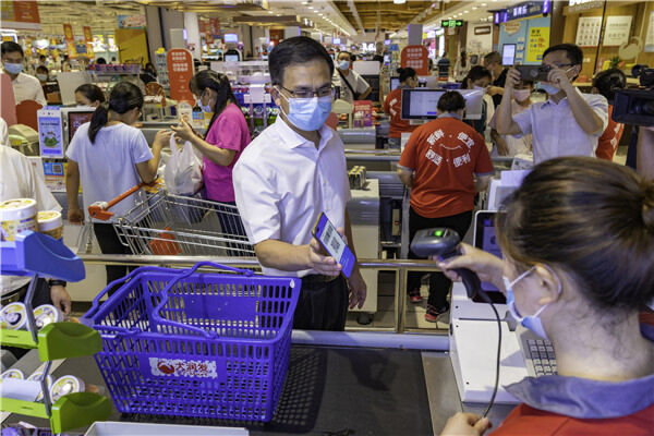 “满载而归!”10多分钟后,购物篮里已堆满了各种商品。扫码结账之后,一行人提着沉甸甸的购物袋离开商场。