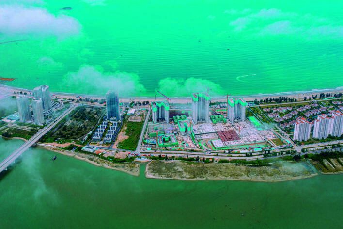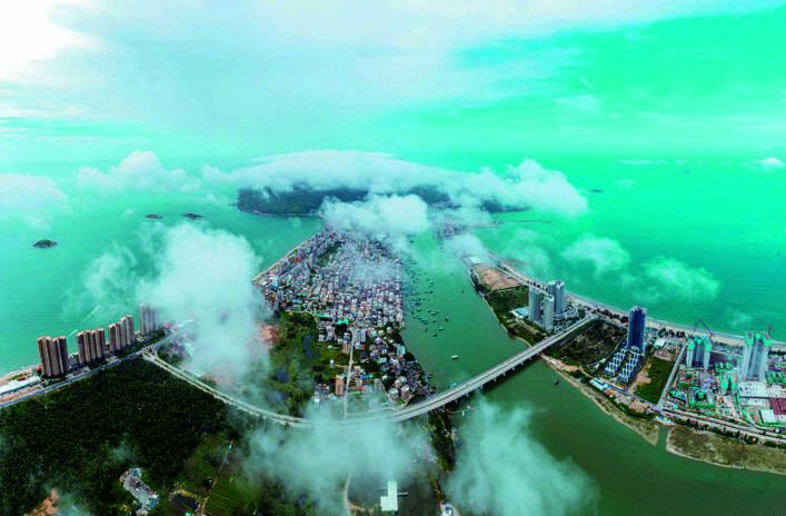 在500米的高空之上俯瞰,蓝天伸手可触,云海脚下翻滚,整个港口滨海旅游度假区生机勃勃。大星山以及大亚湾、红海湾两湾在云中若隐若现,远处还可见郁郁葱葱的小星山岛。