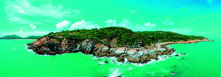 碧蓝的大海、翠绿的森林、婀娜的礁石、银白的沙滩、穿梭的渔舟、神秘的小岛……从空中看去,这里有山海星河,有人间烟火,共同构成一幅幅动静交融的南国渔港油画。