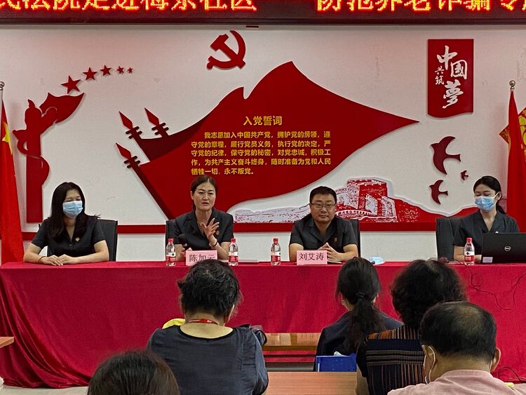 讲座分为宣讲和互动两个环节。在普法宣讲环节,刑二庭法官陈加云向与会老年人开展专题讲座。讲座共三个部分,结合真实数据、案例分析了打击整治养老诈骗的紧迫性和重要性,总结了养老诈骗六种常见套路,提出了预防养老诈骗的六条小贴士。