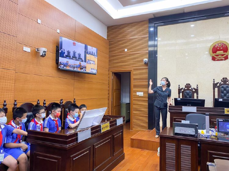 清水河法庭的法官曹欣邀请同学们参观了审判庭,介绍了审判庭里各个身份席位,展示了庭审系统、监控屏、法槌等。同学们还通过中国庭审公开网观看了一场民事案件庭审直播,每位同学都热情高涨、聚精会神。大家不仅感受到了法庭的庄严肃穆,还切实感受到庭审的公开性,增强了对法律、法庭的敬畏心。