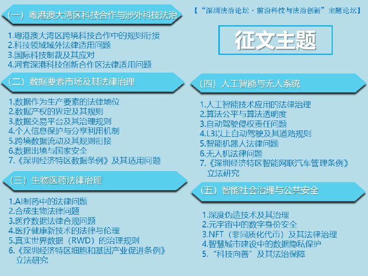 征文聚焦“前沿科技与法治创新”,选题主要包括粤港澳大湾区科技合作与涉外科技法治、数据要素市场及其法律治理、生物医药法律治理、人工智能与无人系统、智能社会治理与公共安全等五大方面。