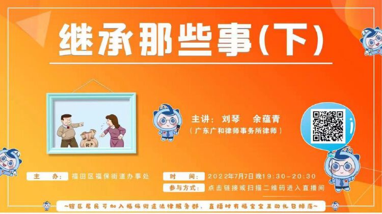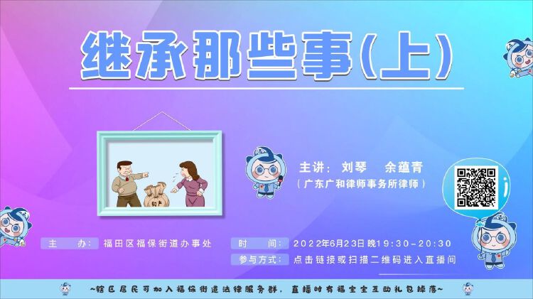 6月23日19:30,余律师在福保街道普法直播间介绍民法典出台后关于继承的新增法律亮点,为居民们讲解了虚拟财产的继承问题、新增的遗嘱形式、遗产管理人制度、宽宥制度等相关内容。