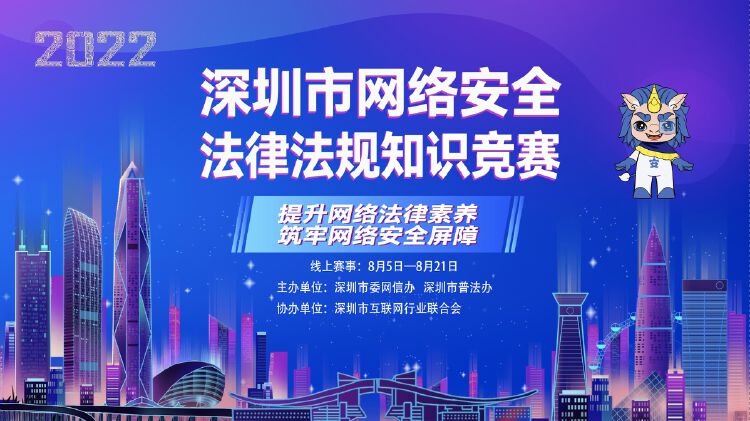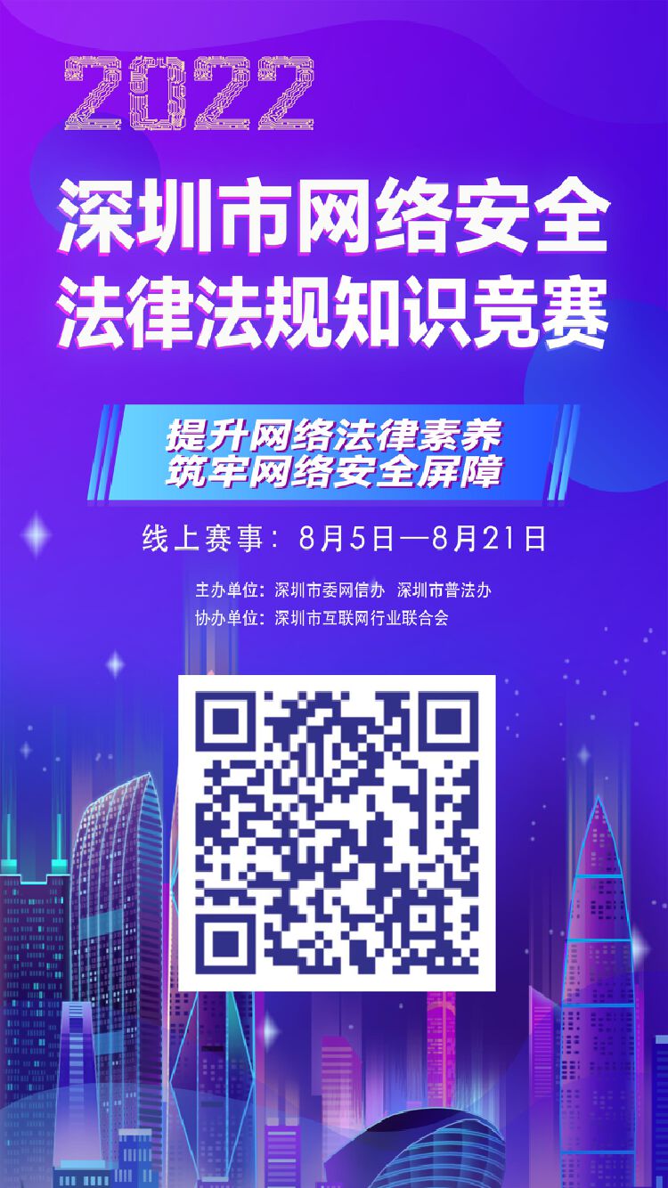 2022深圳市网络安全法律法规知识竞赛由深圳市委网信办联合市普法办组织开展。赛事深度融入年轻圈层的关注话题,增加电竞玩法,更契合年轻用户的生活方式,从而推动全民关注,实现知识普法。竞赛包括线上和线下两种形式,线上答题系统设置荣誉体系,以年轻人喜爱的“热血闯关”作为核心表达;线下决赛将结合时下年轻人流行的电竞风格,借鉴职业联赛战队出场形式,打造电竞感场景。
