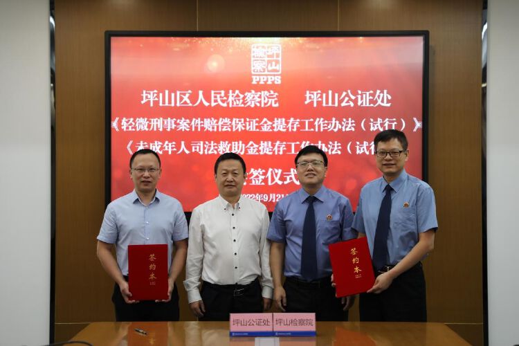 9月21日上午,坪山区人民检察院举行《轻微刑事案件赔偿保证金提存工作办法(试行)》《未成年人司法救助金提存工作办法(试行)》会签仪式,坪山区人民检察院检察长李荣斌、坪山区司法局局长白宁等相关负责人出席签约仪式。