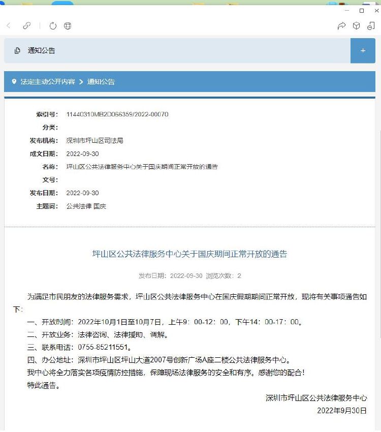 9月30日,坪山区公共法律服务中心在坪山政府在线发布了《坪山区公共法律服务中心关于国庆期间正常开放的通告》,以便群众及时了解相关事宜。此次值班模式为工作人员加专职律师两人组合的形式,使得值班能发挥切实效用。
