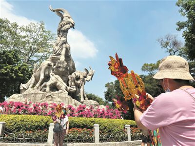 游客与五羊雕像合影。