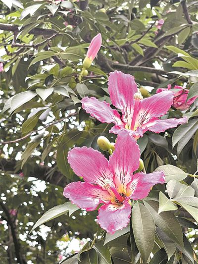 大腹木棉也是美化环境的优良树种,与美丽异木棉的主要区别是树干下部膨大,成年树树干呈酒瓶状,花冠淡紫红色、中心白色。在荔湾区彩虹文化广场入口处,就能一睹其风采。
