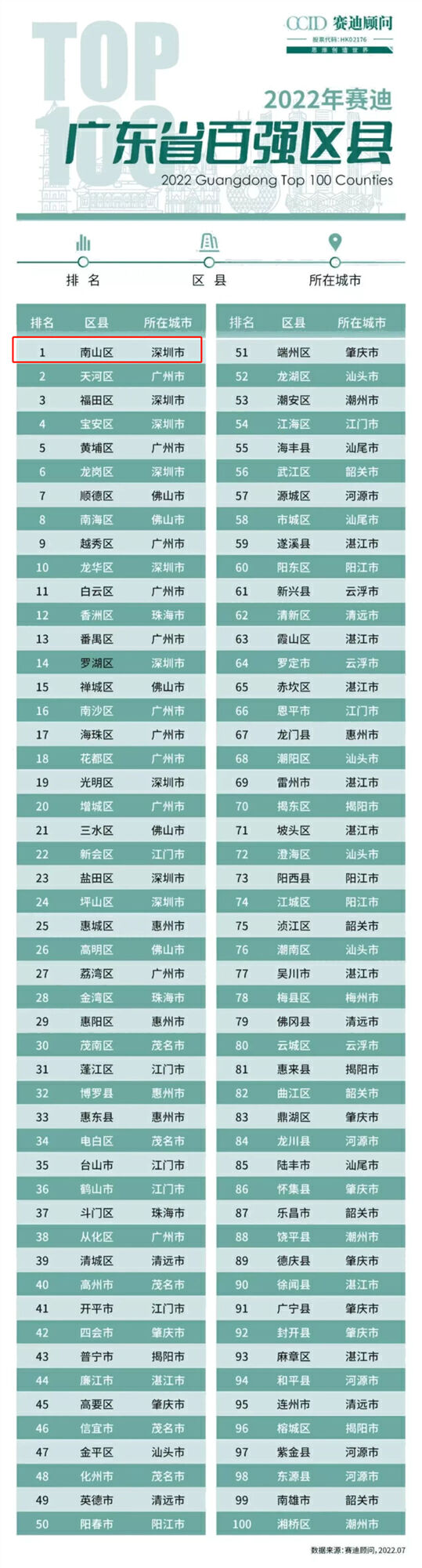 此前,在赛迪顾问城市经济研究中心发布的另一份榜单《2022年中国城区经济高质量发展研究报告暨2022赛迪百强区》中,南山区排百强区第一名。这也是南山区连续五年排名百强区首位,充分显示了南山依然是粤港澳大湾区乃至中国最具活力的区域之一,也印证了社会各界看好南山的发展。
