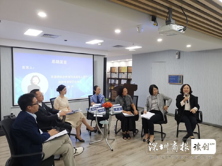 深圳市律协教育与未成年人保护法律专业委主任李严(右一)就研讨活动进行总结