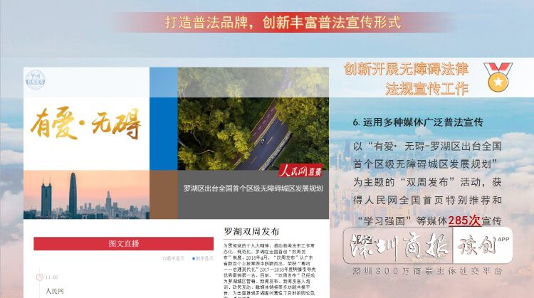 罗湖区残联创新开展无障碍法律法规宣传工作,先行探索高密度建成区级无障碍建设路径,正式出台了全国首个区级无障碍城区发展规划——《罗湖区无障碍城区发展规划(2020-2035)》,用实际行动宣传和践行《无障碍环境建设条例》。罗湖区残联联合罗湖区人民检察院建立无障碍公益诉讼机制,强化协同督导宣传,以圆桌磋商的方式,对责任单位开展督导宣传。该单位还举办了以“从有爱到无碍——罗湖区推出全国首个区级无障碍城区发展规划”为主题的“双周发布”活动,获得人民网全国首页特别推荐和“学习强国”等媒体平台共285次宣传报道。2021年7月,罗湖区残工委荣获国务院颁发“全国残疾人工作先进单位”。