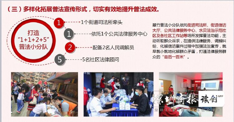 罗湖区翠竹街道办整合社区法律顾问资源,打造一支由5个社区法律顾问组成的“一社区一法律顾问”普法小分队,围绕邻里关系、婚姻家庭、社会保障、劳动劳务关系等重点领域,将普法宣传与解决群众实际问题有效结合起来。该街道推进法治建设,促进法治中心工作落实,成立“光明模式”基层治理矛盾纠纷联调处,整合人民调解、法律援助、宣传咨询等多重功能,充分发挥“法官+调委会+律师团队”调解优势及司法确认“一锤定音”法律效应;联合法院、公证处通过“街镇+司法+公证”的模式开展矛盾纠纷治理和民商事纠纷诉前调解工作,助力于创新司法体制改革和推动构建社会矛盾纠纷综合治理机制。