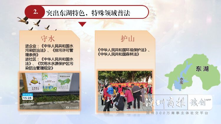 罗湖区东湖街道办内设各部门分工负责、通力合作,由各部门、社区、挂点律师、义工以及公益人士组成一支普法志愿者队伍,共同做好全街道“谁执法谁普法”责任制落实工作,推动东湖街道法治建设新局面的形成,在普法队伍中特别邀请了人大代表参与其中。该街道根据地缘特点,突出特殊领域普法,进企业宣传《中华人民共和国水污染防治法》《排污许可管理条例》,进社区宣传《中华人民共和国水法》《饮用水水源保护区污染防治管理规定》,并结合热点与辖区居民需要,针对类案进行以案释法。
