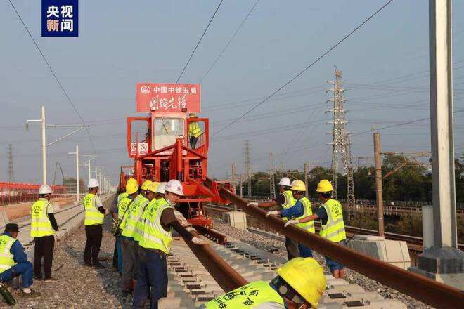 11月18日下午,在广州新塘广汕高铁施工现场,随着中铁五局作业人员操纵着牵引车将一对500米长轨平稳地铺设在广汕高铁路基上,标志着广汕高铁正式进入全线铺轨阶段,朝着开通运营迈出关键一步。