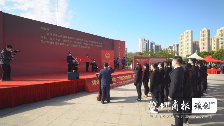 活动在公职人员宪法宣誓仪式中拉开序幕,坪山区司法局主要负责人带领新入职公务员进行宪法宣誓,通过宣誓以及群众观看宣誓仪式,强化他们对宪法的拥护和真诚信仰。