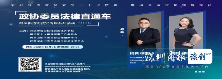 12月9日晚,福保街道“政协委员法律直通车”直播活动火热开播。此次直播主讲人福田区政协委员杨新律师、民革深圳市法援中心委员周艳律师围绕“宪法的前世今生和如何弘扬宪法精神”为主题,并结合近年来办理的各类典型案件,详细解答了网友咨询的相关法律问题,耐心讲解了《民法典》典型案例,让《宪法》《民法典》真正融入每个人的生活,成为护航权益与幸福的“宝典”。