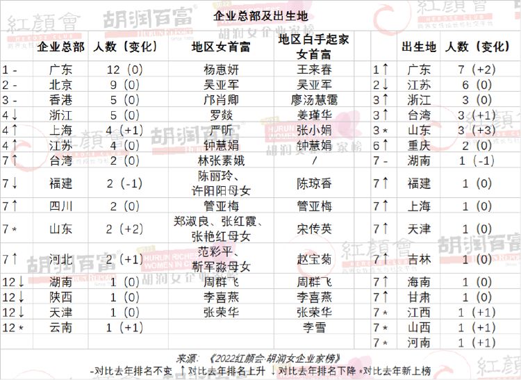 从出生地来看,粤商再次成为第一,有7位,比去年多2位;苏商第二,比去年减少1位至5位;浙商第三,比去年增加1位至4位。白手起家的女企业家中,粤商和苏商最多。最年轻的白手企业女企业家是总部深圳的求婚钻戒品牌DR35岁的卢依雯,财富165亿元。