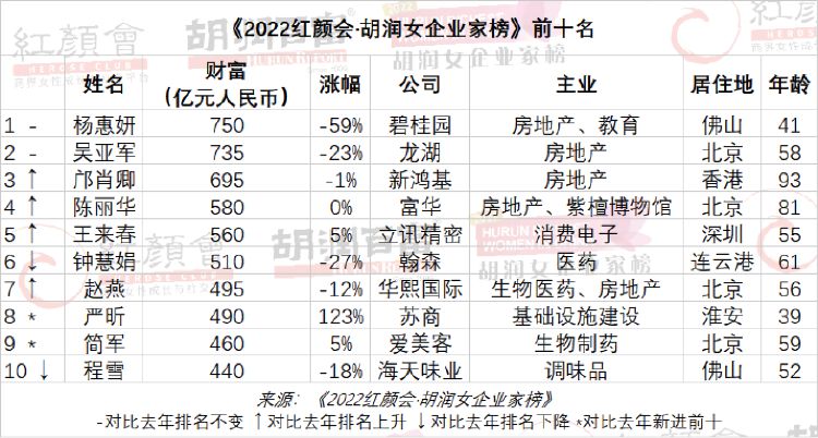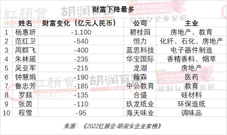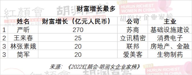 财富增长最多的是苏商39岁的严昕,增长了270亿元;财富缩水最多的杨惠妍,缩1,100亿元;其次是恒力石化55岁的范红卫,缩水了540亿元。