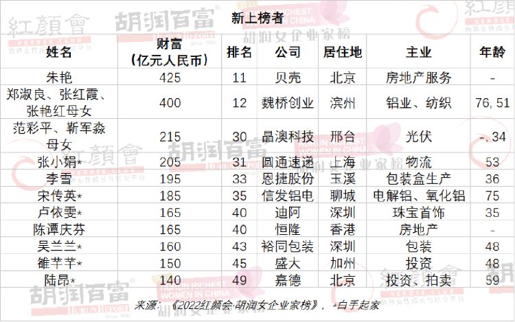 郑淑良、张红霞、张艳红母女以400亿元财富排名第12位。郑淑良为魏桥创业已故创始人之妻。张红霞、张艳红是二代,目前两人主要负责家族的纺织产业,其中长女张红霞总揽全局,小女儿张艳红负责威海园区。