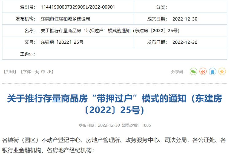 12月30日,东莞发布《关于推行存量商品房“带押过户”模式的通知》(东建房〔2022〕25号),明确商品房可“带押过户”,进一步优化我市营商环境,提升存量商品房交易便捷度和安全性。
