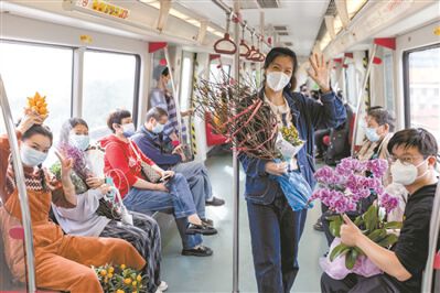 广州地铁5号线滘口站内,几位年轻人手提肩扛着蝴蝶兰、富贵竹、五代同堂、桃花树和蜡梅等年宵花踏上地铁,车厢内立刻生机勃勃,俨然成为“鲜花专列”。