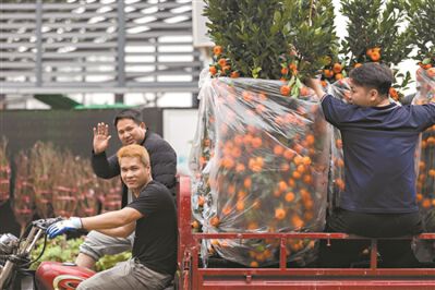 岭南花卉市场,运送年桔的三轮车上,三位小伙朝着镜头挥手致意,年味满满。