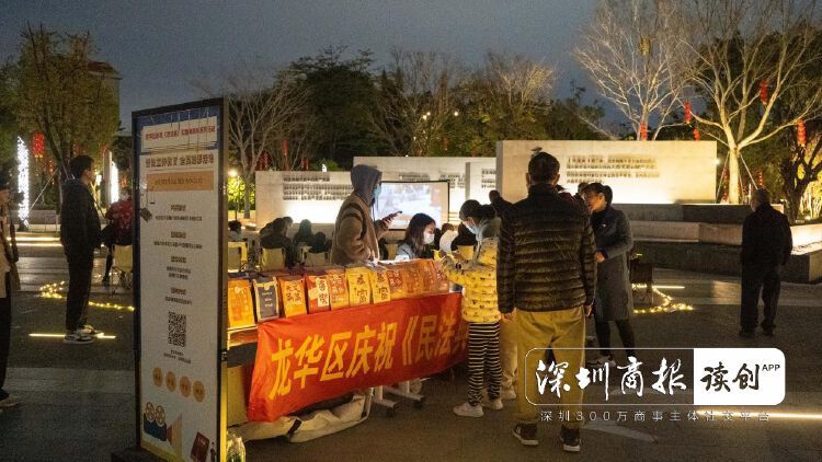 1月15日,正值南方小年,夜色降临,华灯初上,在深圳民法公园入口处,放映员正在挂荧幕、布线路、架设备,播放露天电影,在场的法律专业人士还对电影中涉及法治的知识点进行了讲解。
