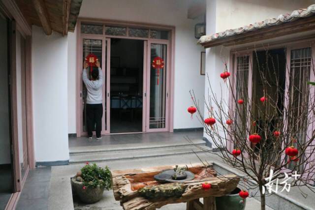 民宿管理人员贴窗花。