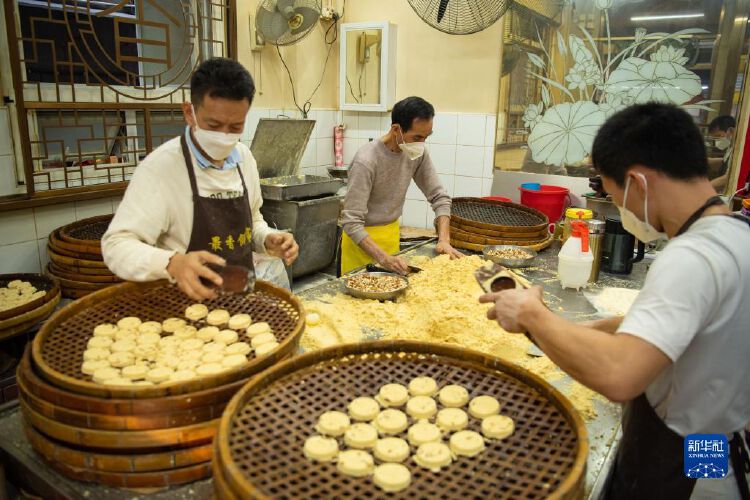 1月18日,澳门“最香饼家”员工在制作手工炭烧杏仁饼。