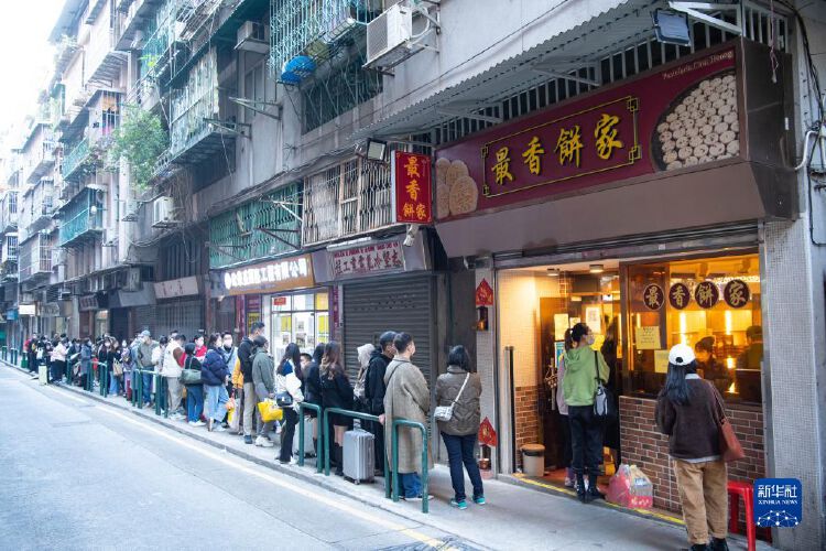 1月18日,游客在澳门“最香饼家”店外排队购买手工炭烧杏仁饼。