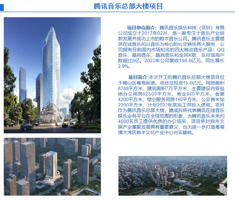 本次集中开工仪式的主会场项目腾讯音乐总部,总投资15.8亿元,计划2027年底完工并投入使用。该项目将建设集总部管理、研发试验等总部功能中心及音乐文化体验中心为一体的总部大楼,推动音乐产业生态发展,带动上下游企业聚集,进一步提升深圳音乐文化产业能级,铸造深圳大湾区数字文化产业中心。