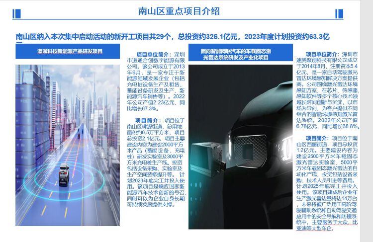 为智能网联汽车产业增添新动能。总投资2.1亿元的道通科技新能源产品研发项目,将建设2000平方米产品(蓄能设备、充电桩)研发实验室及3000平方米充电桩生产线。总投资1.2亿元、面向智能网联汽车的车载固态激光雷达系统研发及产业化项目,建成后企业年生产激光雷达量将达14万台,未来将被广泛用于高阶驾驶辅助系统和自动驾驶交通应用中的安全导航和防撞系统中。