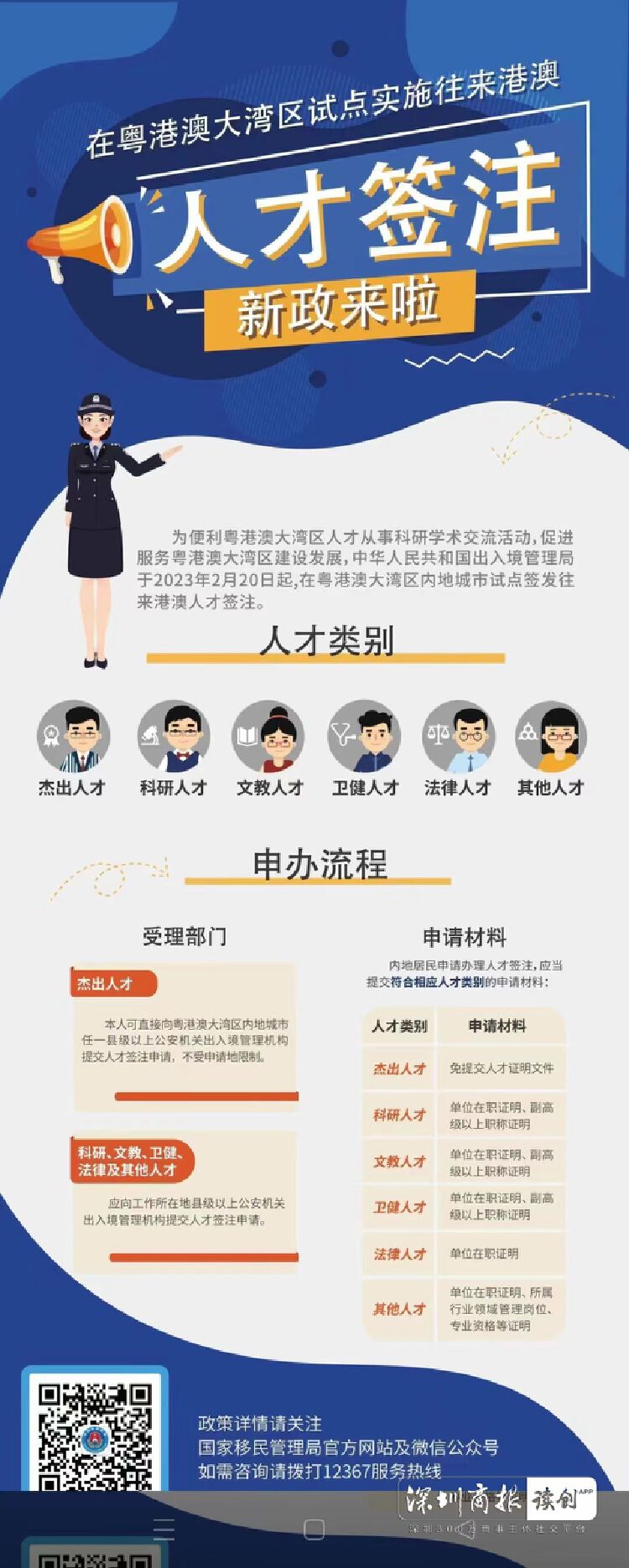 人才签注的申请材料和申办手续,可通过中华人民共和国出入境管理局、广东省公安厅出入境管理局政府网站或者12367服务平台查询。