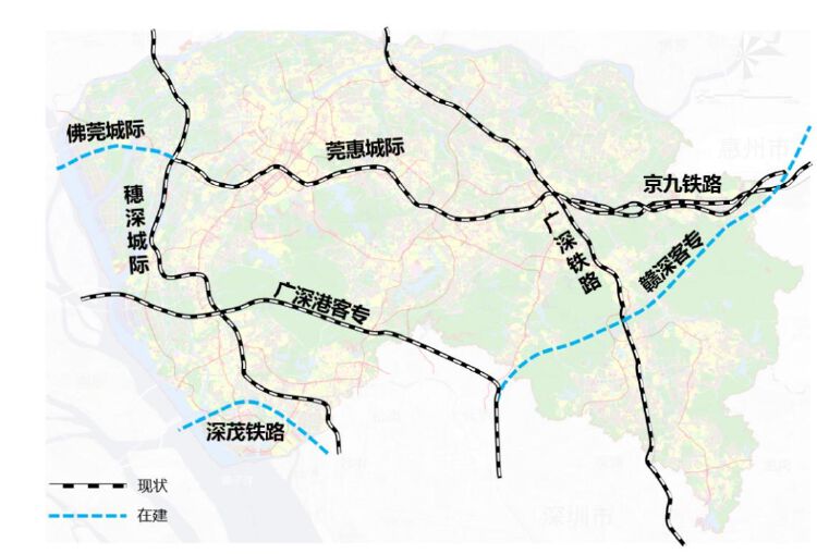 加快建设深圳至江门铁路(东莞段),积极谋划广深第二高铁的前期工作并引入中心城区,争取“十四五”时期开工建设。加快城际轨道网络建设,建成佛莞城际(东莞段),新建佛山经广州至东莞城际(东莞段)、深惠城际(东莞段),推进中南虎城际(东莞段)、塘厦至龙岗城际(东莞段)、莞深中轴城际(原常平至龙华城际)(东莞段)的前期工作,具备条件的争取尽快开工建设;按照广州都市圈、深圳都市圈的发展要求,将莞深中轴城际(原常平至龙华城际)(东莞段)调整经松山湖,并与佛山经广州至东莞城际(东莞段)整合为广深中轴城际;将广深中轴城际与深莞增城际在寮步至光明科学城段进行通道整合,推动广州、深圳都市圈联动发展,共同打造轨道上的大湾区。