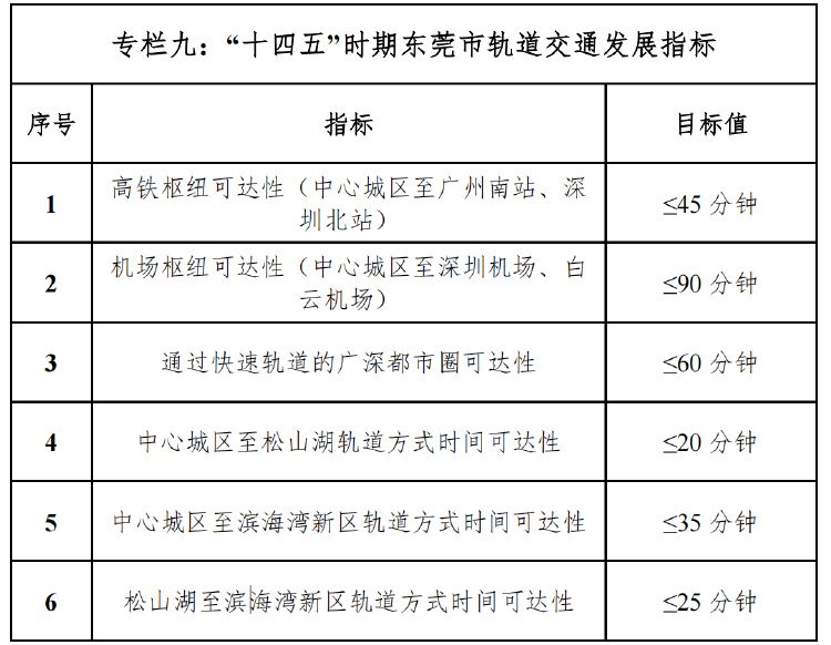 ——区域辐射力更强,湾区互联互通更畅。至2025年,实现国家铁路146.1km,推进城际铁路开通129.2km,力争实现东莞市中心城区的国铁始发功能,实现与京津冀城市群8小时可达,长三角城市群5小时可达,融入全国城市群发展。60分钟抵达粤港澳大湾区重要城市,45分钟内抵达湾区高铁枢纽,90分钟内抵达机场枢纽。